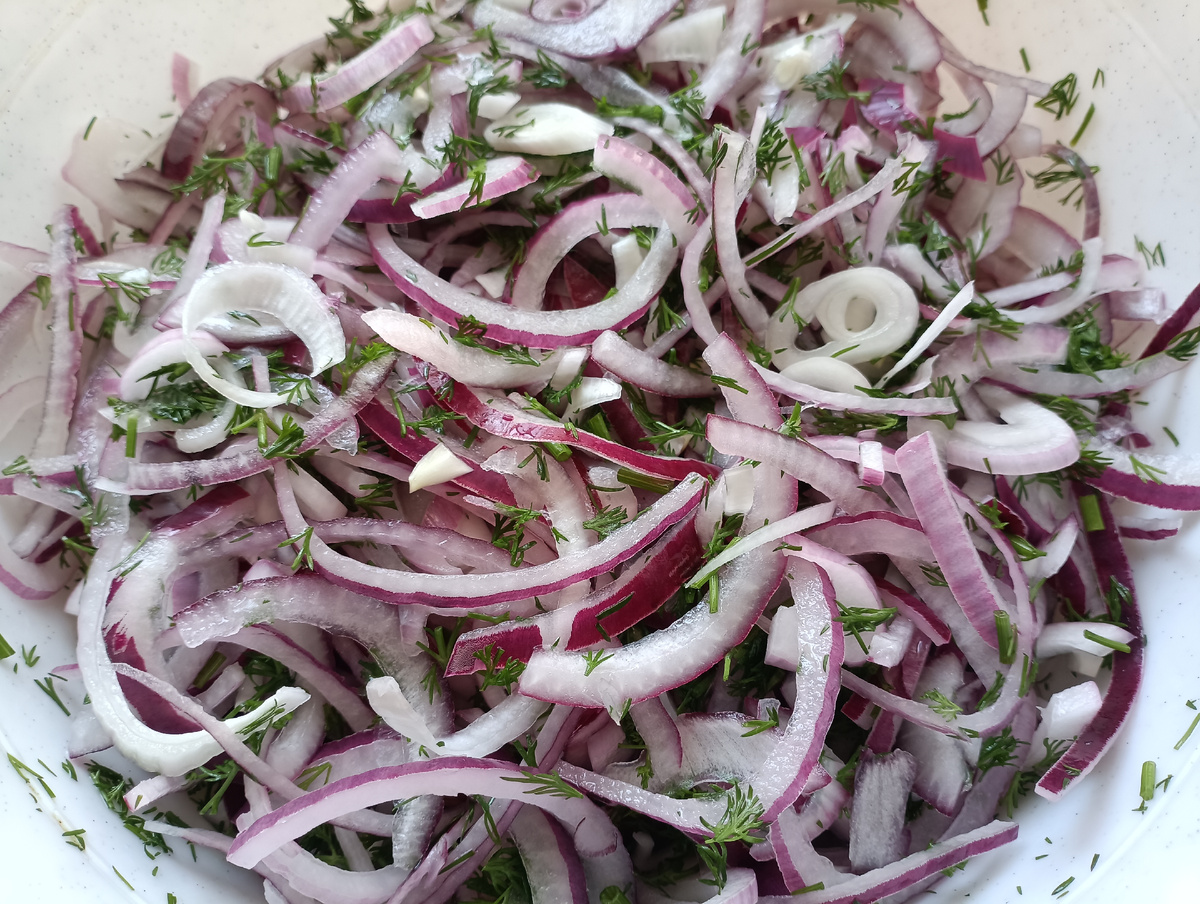 - Příprava ingrediencí. Nakrájejte cibuli, prolisujte česnek. Smíchejte s částí oleje z konzervy s tuňákem a citronovou šťávou. Nakrájejte rajčata a papriku.